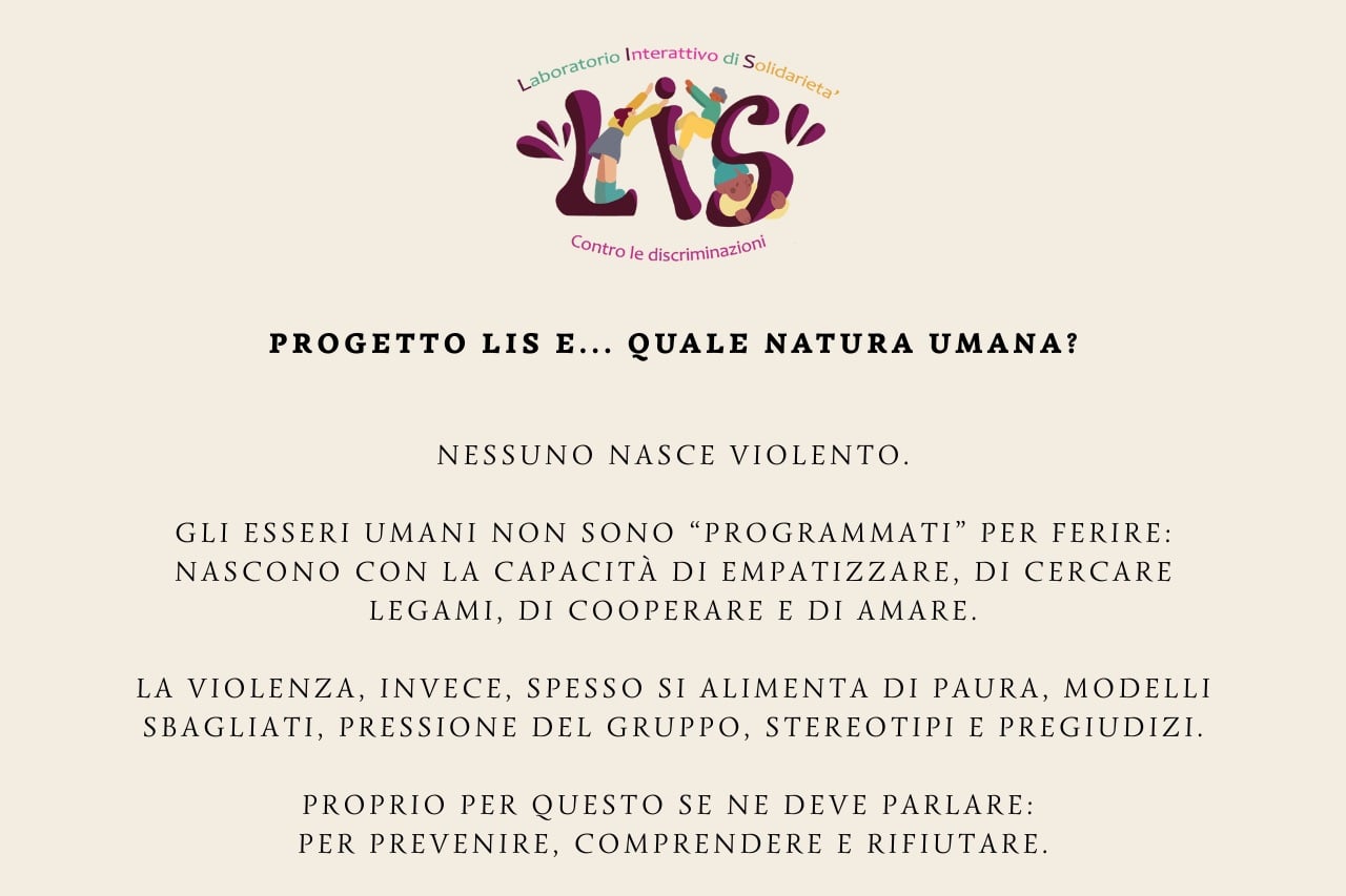 Durante l’ultimo laboratorio del progetto “LIS: Laboratorio Interattivo di Solidarietà contro le discriminazioni”, abbiamo parlato delle diverse forme di violenza: da quella che, a livello mondiale, si manifesta nei conflitti armati, a quella che può insinuarsi nelle relazioni private; dal bullismo alla violenza di genere. Abbiamo chiesto proprio alle alunne e agli alunni cosa ne pensassero e ne abbiamo discusso insieme. La violenza è diffusa e assume molte forme, ma nessuno nasce violento. E parlarne serve proprio a questo: a costruire idee chiare e consapevoli per riconoscerla e rifiutarla.