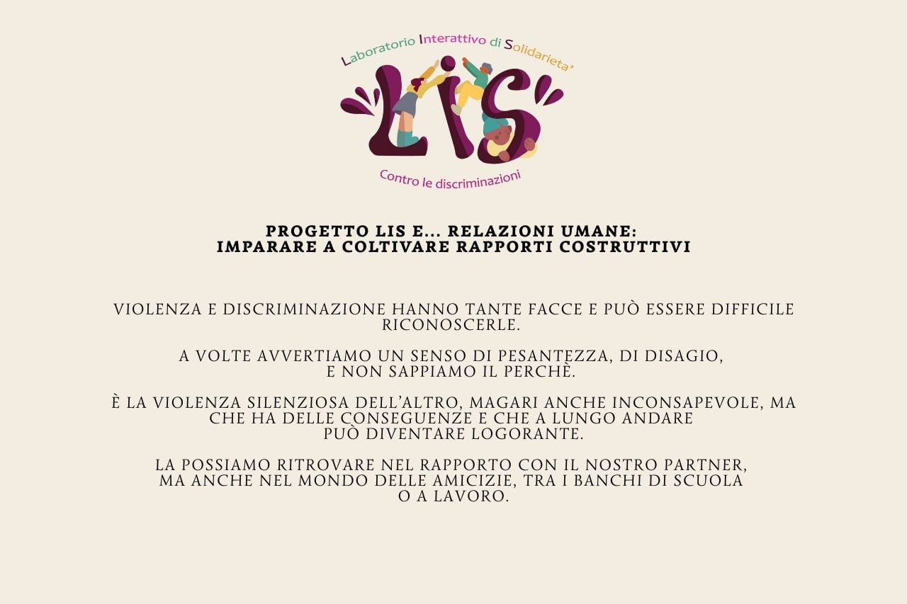 È iniziato lo sportello psicologico del progetto “LIS: Laboratorio Interattivo di Solidarietà contro le discriminazioni”. Un servizio pensato per offrire uno spazio di ascolto e consulenza professionale in un contesto sicuro e confidenziale. Lo sportello è un’occasione per dare un nome a ciò che si prova e per comprendere meglio le dinamiche di rapporto.