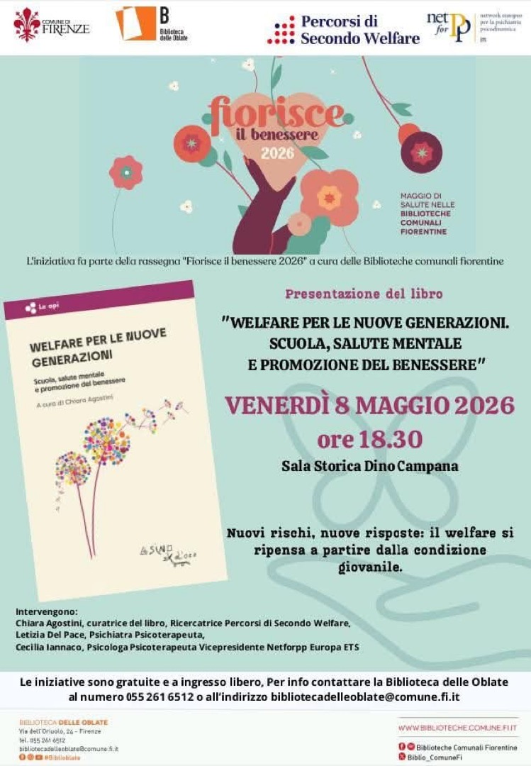 Venerdì 8 Maggio all’interno della rassegna “Fiorisce il benessere”, a cura delle Biblioteche comunali fiorentine in collaborazione con la nostra associazione, si presenterà il libro “Welfare per le nuove generazioni”, curato da Chiara Agostini di Percorsi di Secondo Welfare.
